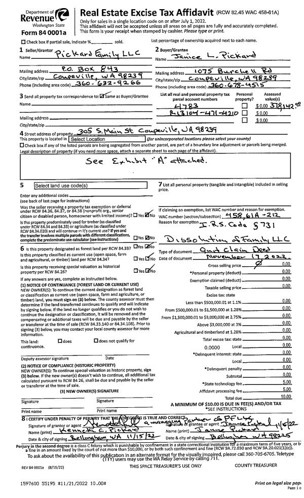 | 2 | 11/17/2022 | QCD | Quit Claim Deed | PICKARD FAMILY LLC | PICKARD, JANICE L. | | | $0.00 | 55195 | 4554043 |