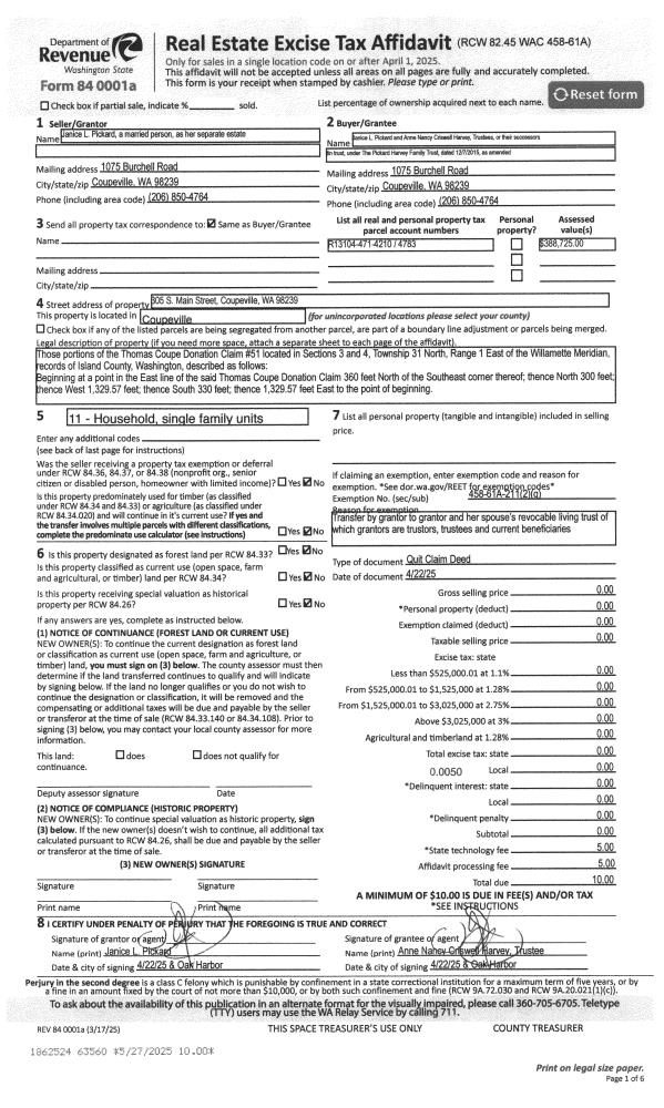 | 1 | 04/22/2025 | QCD | Quit Claim Deed | PICKARD, JANICE L. | PICKARD TTEE, JANICE L | | | $0.00 | 63560 | 4586246 |