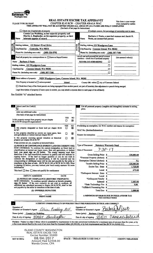| 2 | 07/30/2017 | WD | Warranty Deed | WALKLING 3/4 INT, CONNIE L | NOSTE, BARBARA J | | | $135,000.00 | 30489 | 4427573 |