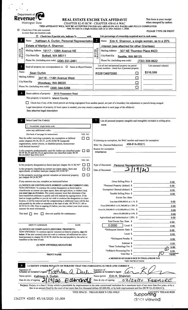 | 1 | 02/19/2020 | PRD | Personal Representatives Deed | SHANNON, MARILYN A | DURBIN, SEAN | | | $0.00 | 43053 | 4486797 |