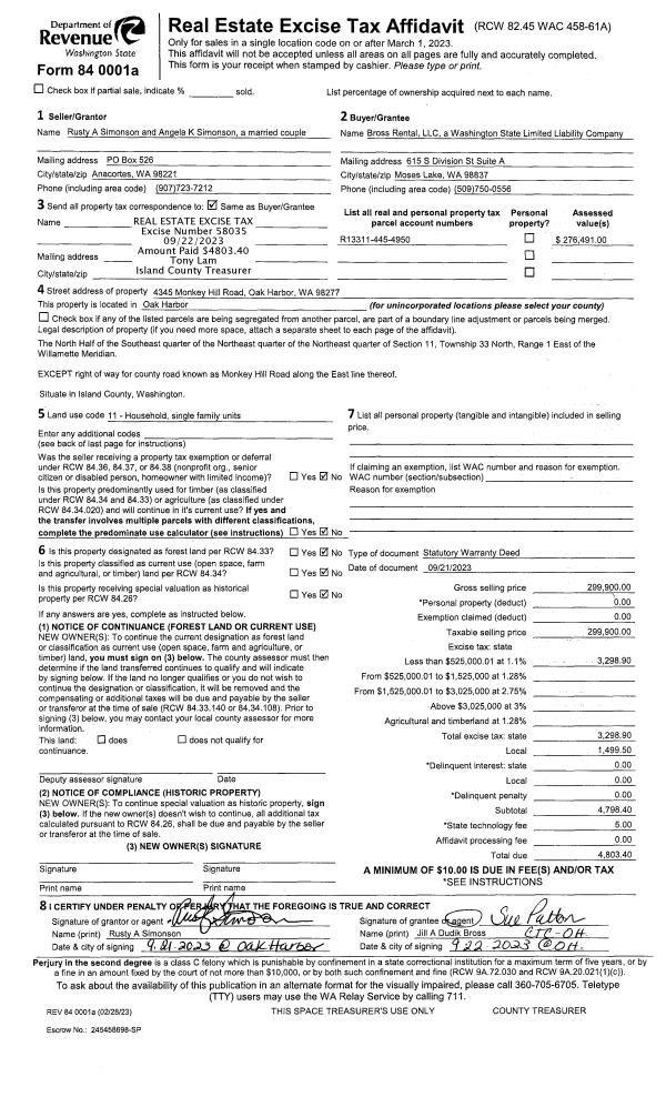 | 1 | 09/21/2023 | WD | Warranty Deed | SIMONSON, RUSTY A | BROSS RENTAL, LLC | | | $299,900.00 | 58035 | 4564933 |