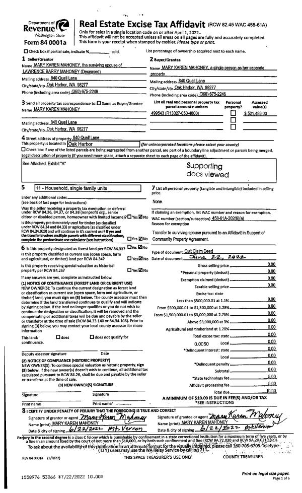 | 1 | 06/22/2022 | QCD | Quit Claim Deed | MAHONEY, LAWRENCE B | MAHONEY, MARY K | | | $0.00 | 53866 | 4548577 |