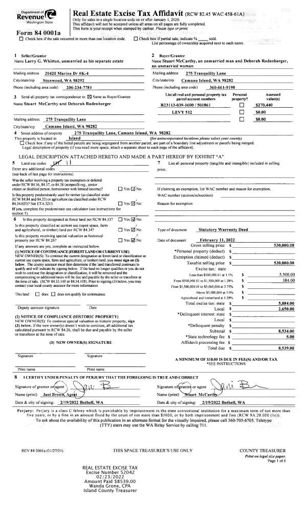 | 1 | 02/11/2022 | WD | Warranty Deed | WHITTON, LARRY G | MCCARTHY, STUART | | | $530,000.00 | 52042 | 4540204 |