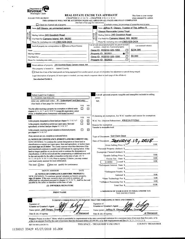 | 3 | 01/17/2018 | QCD | Quit Claim Deed | GLASPY, JEFF | GLASPY TTEE, JEFFREY R | | | $0.00 | 33429 | 4441462 |
