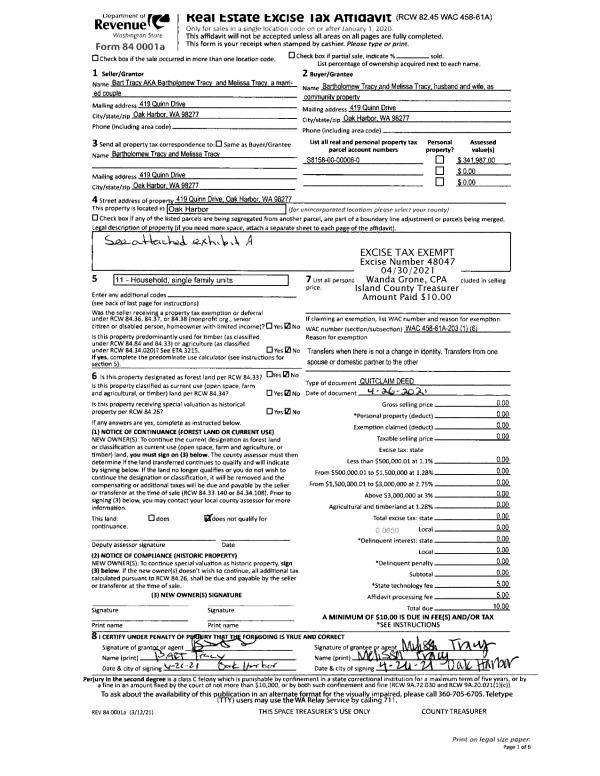 | Mailing Address: | MELISSA TRACY 419 QUINN DR OAK HARBOR, WA 98277 | % Ownership: | 100.0000000000% |