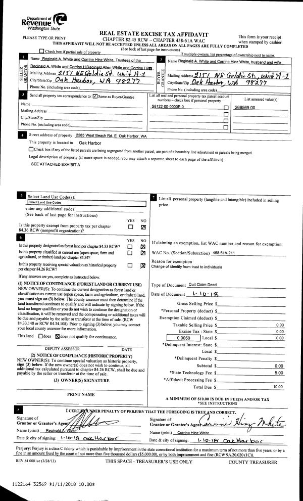 | 4 | 01/10/2018 | QCD | Quit Claim Deed | WHITE TRUSTEE, REGINALD A | WHITE, REGINALD A | | | $0.00 | 32569 | 4437264 |