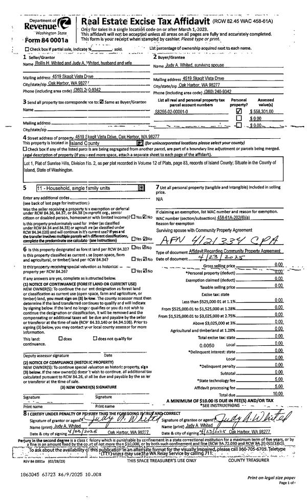 | 1 | 04/23/2025 | CPADC | Comm Prop Agmnt & Death Cert | WHITED, ROLLIN H / JUDY A | WHITED, JUDY A | | | $0.00 | 63723 | 4586760 |