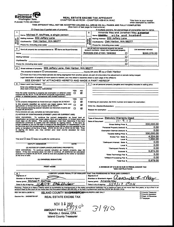 | 1 | 11/09/2017 | WD | Warranty Deed | MCPHEE, MICHAEL P | MAY, AMANDA | | | $330,000.00 | 31910 | 4434125 |