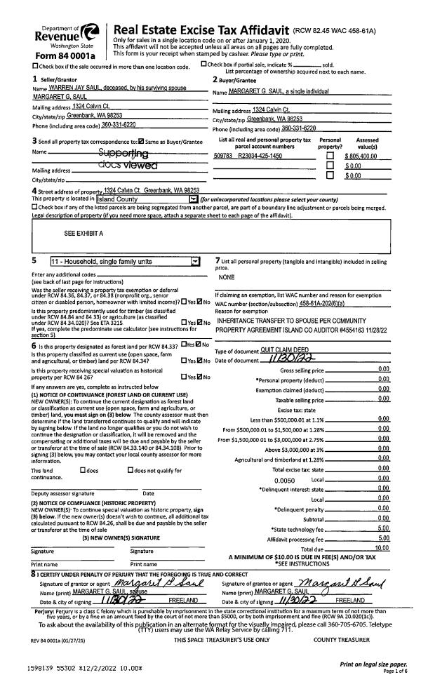 | 1 | 11/30/2022 | QCD | Quit Claim Deed | SAUL, WARREN J | SAUL, MARGARET G. | | | $0.00 | 55302 | 4554470 |