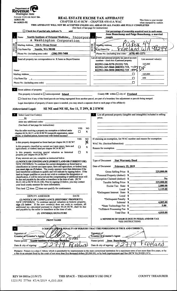 | 1 | 02/25/2019 | WD | Warranty Deed | SEATTLE INSTITUTE OF ORIENTAL MEDICINE | BEAUCHAMP, JESSE | | | $0.00 | 37780 | 4460076 |