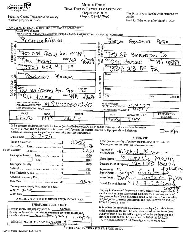 | 2 | 12/07/2023 | MANHOME | Manufactured Home | MANN, MICHELLE | PENA, SERGIO GONZALEZ | | | $5,500.00 | 58700 | |