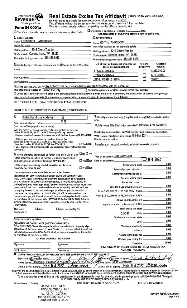 | 1 | 02/04/2022 | QCD | Quit Claim Deed | AMBSDORF, FREDERICK L | AMBSDORF, EDITH L | | | $0.00 | 51868 | 4539176 |