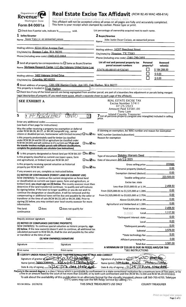 | 1 | 07/22/2023 | WD | Warranty Deed | VANWYE, JASON | CARIASO, JOHN JUSTIN OASCAR | | | $223,500.00 | 57411 | 4562656 |