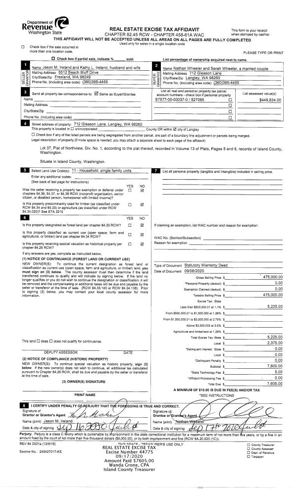 | Mailing Address: | SARAH WHEELER 712 GLEASON LN LANGLEY, WA 98260 | % Ownership: | 100.0000000000% |