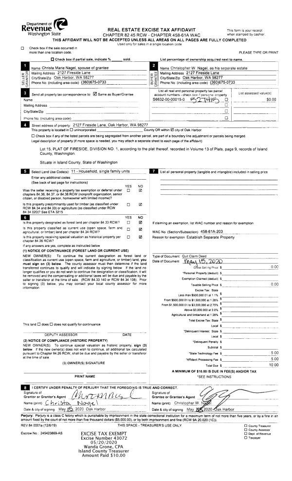 | 2 | 09/17/2020 | QCD | Quit Claim Deed | NAGEL, CHRISTOPHER W | NAGEL, CHRISTOPHER W | | | $0.00 | 44855 | 4497196 |