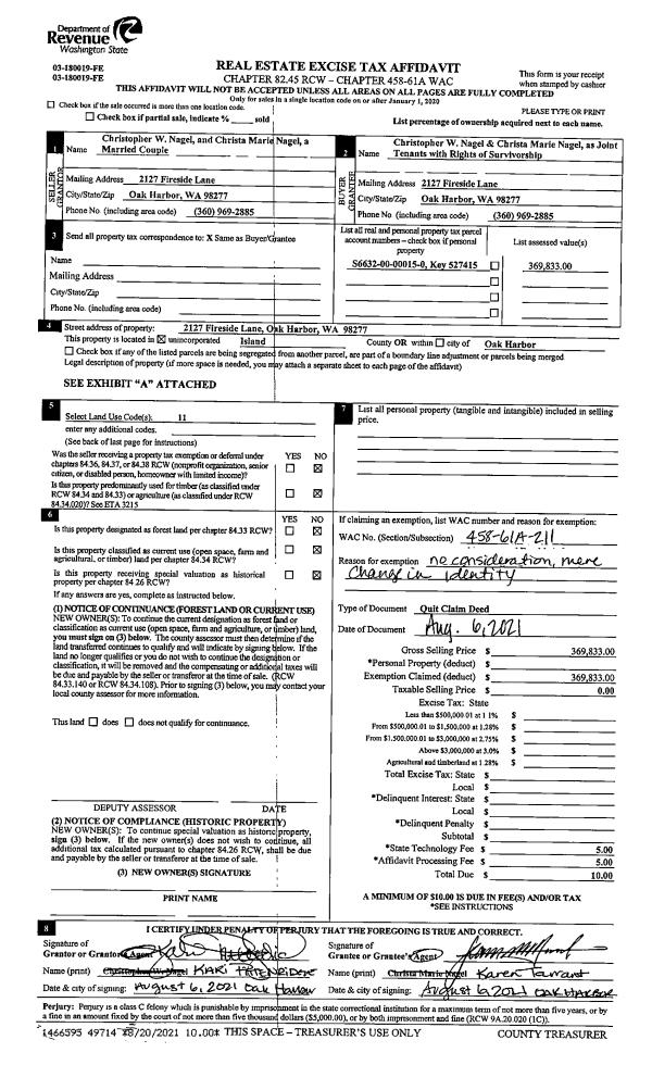 | Mailing Address: | CHRISTA MARIE NAGEL JTWROS 2127 FIRESIDE LN OAK HARBOR, WA 98277 | % Ownership: | 100.0000000000% |