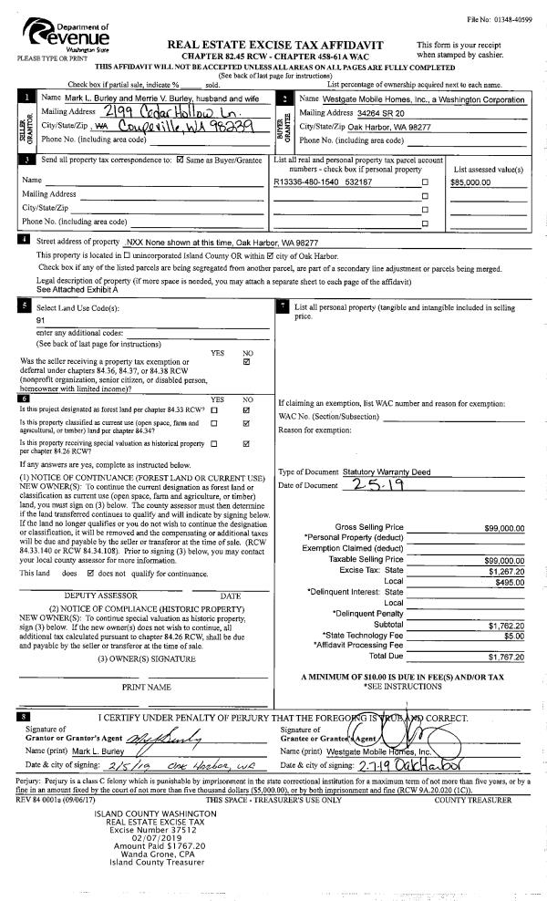 | 1 | 02/05/2019 | WD | Warranty Deed | BURLEY, MARK L | WESTGATE MOBILE HOMES, INC | | | $99,000.00 | 37512 | 4458880 |