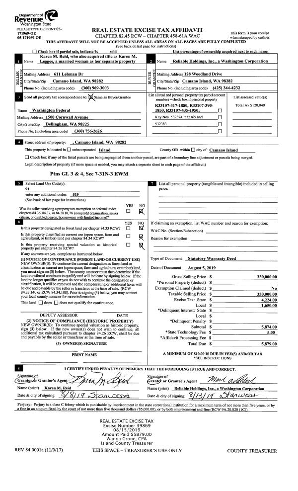 | 2 | 08/05/2019 | WD | Warranty Deed | LEGGEE, KAREN M | RELIABLE HOLDINGS, INC | | | $330,000.00 | 39869 | 4469420 |