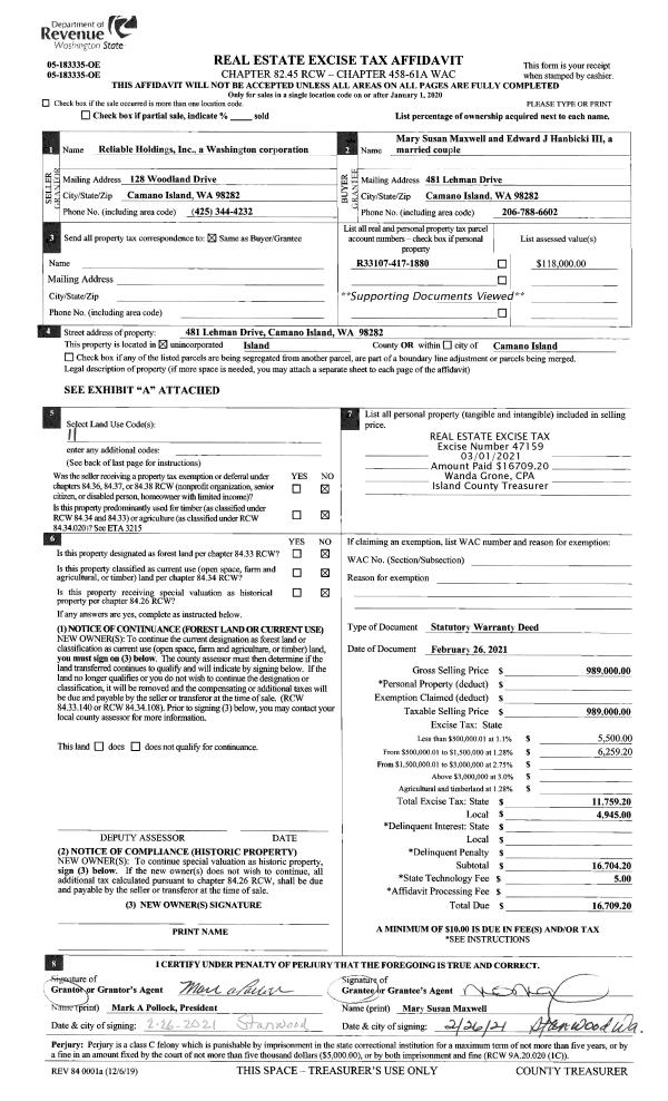 | 1 | 02/26/2021 | WD | Warranty Deed | RELIABLE HOLDINGS, INC | MAXWELL, MARY SUSAN | | | $989,000.00 | 47159 | 4512382 |