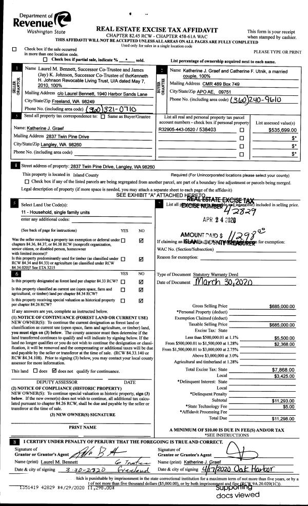 | 1 | 03/30/2020 | WD | Warranty Deed | JOHNSON TRUSTEE, KENNETH H | GRAEF, KATHERINE J | | | $685,000.00 | 42829 | 4485407 |