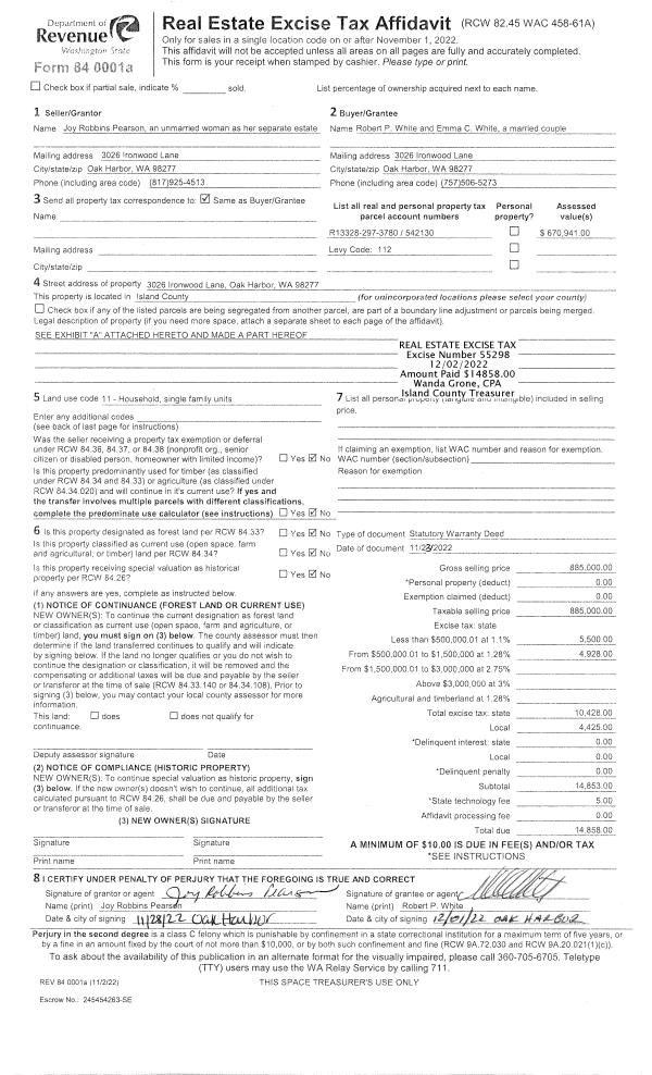 | Mailing Address: | EMMA C. WHITE 3026 IRONWOOD LANE OAK HARBOR, WA 98277 | % Ownership: | 100.0000000000% |