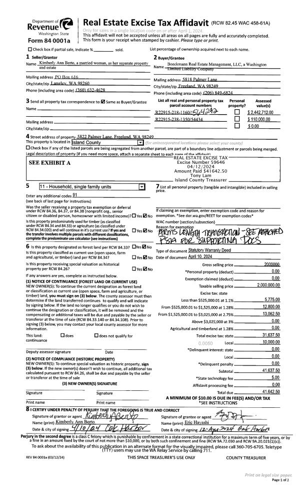 | 1 | 04/10/2024 | WD | Warranty Deed | BERTO, KIMBERLY ANN | BOECKMANN REAL ESTATE MANAGEMENT, LLC | | | $2,000,000.00 | 59646 | 4571187 |
