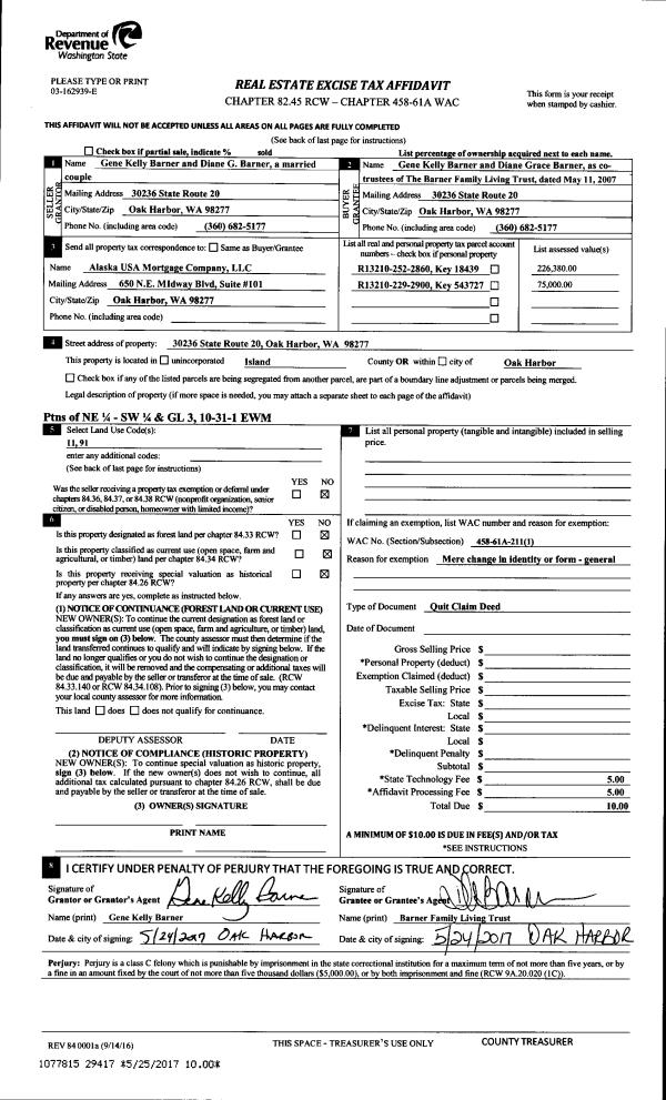 | Mailing Address: | DIANE GRACE BARNER TRUSTEE 30236 STATE RT 20 OAK HARBOR, WA 98277 | % Ownership: | 100.0000000000% |