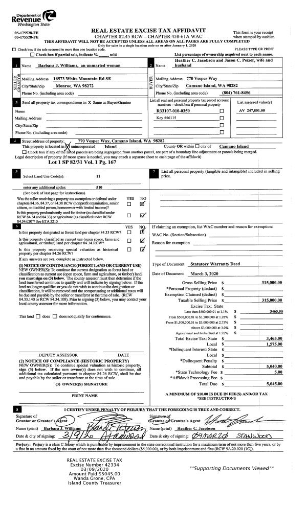 | 1 | 03/03/2020 | WD | Warranty Deed | WILLIAMS, BARBARA J | JACOBSON, HEATHER C | | | $315,000.00 | 42334 | 4482711 |