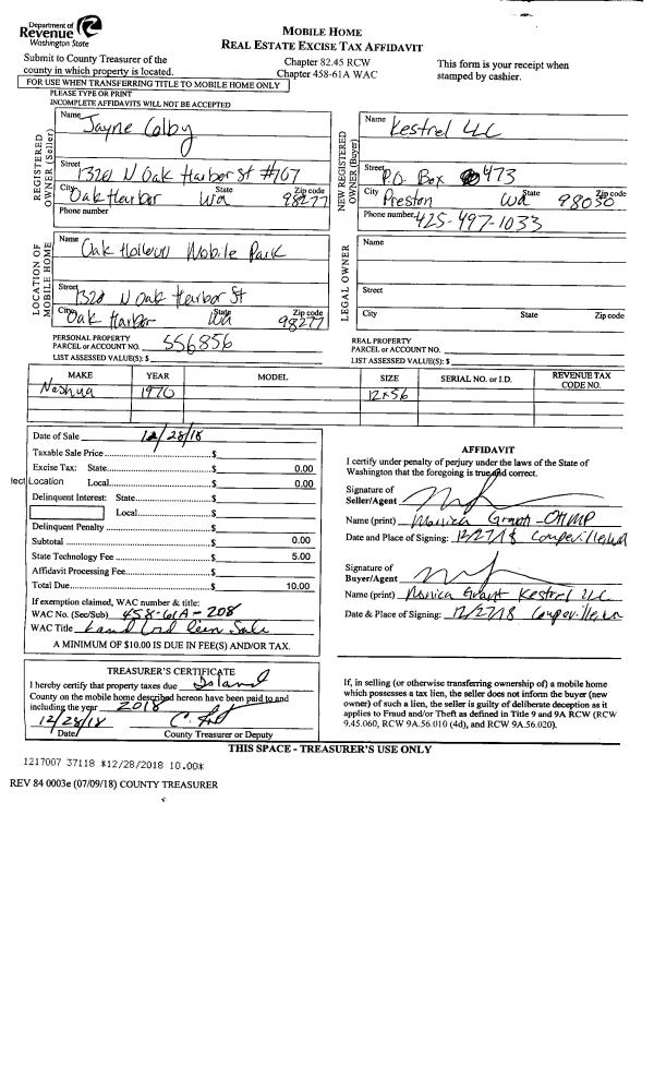 | 5 | 12/28/2018 | MANHOME | Manufactured Home | COLBY, JAYNE DEE | KESTREL LLC | | | $0.00 | 37118 | 4457182 |