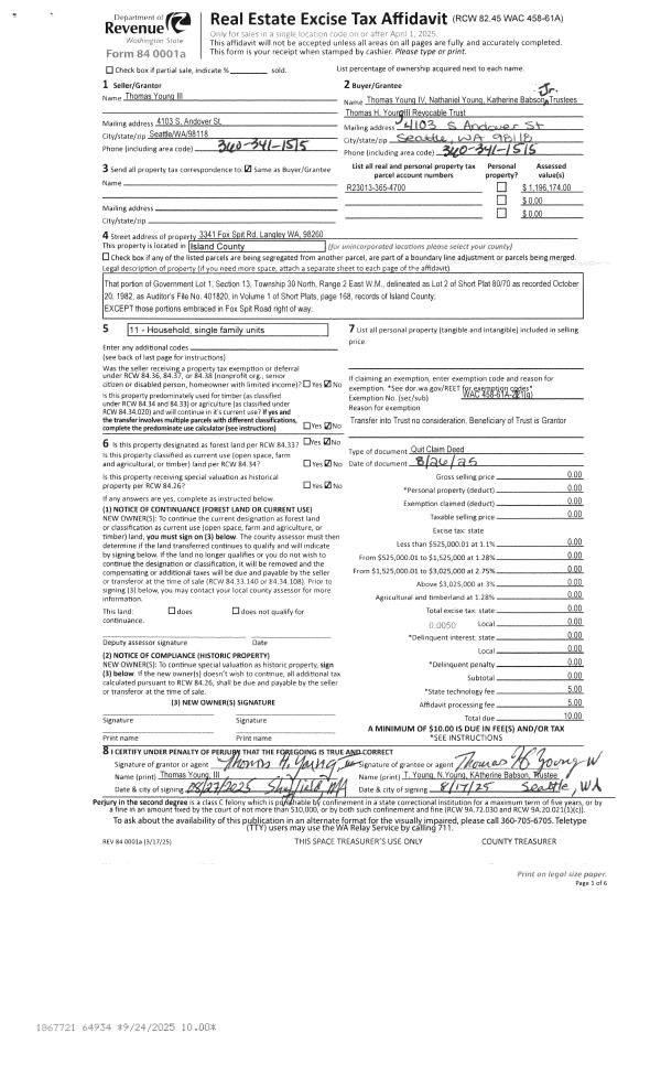 | 2 | 08/26/2025 | QCD | Quit Claim Deed | YOUNG III, THOMAS H | THOMAS H YOUNG III REVOCABLE TRUST | | | $0.00 | 64934 | 4591376 |