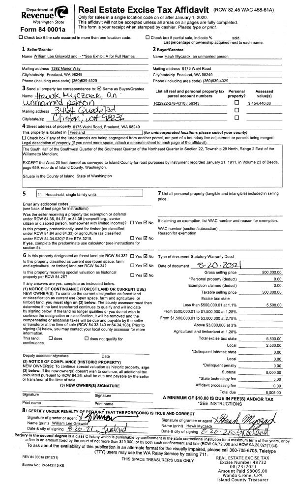 | 2 | 08/20/2021 | WD | Warranty Deed | GRISWOLD JTRWOS, WILLIAM LEE | MYCZACK, HAWK | | | $500,000.00 | 49732 | 4527419 |