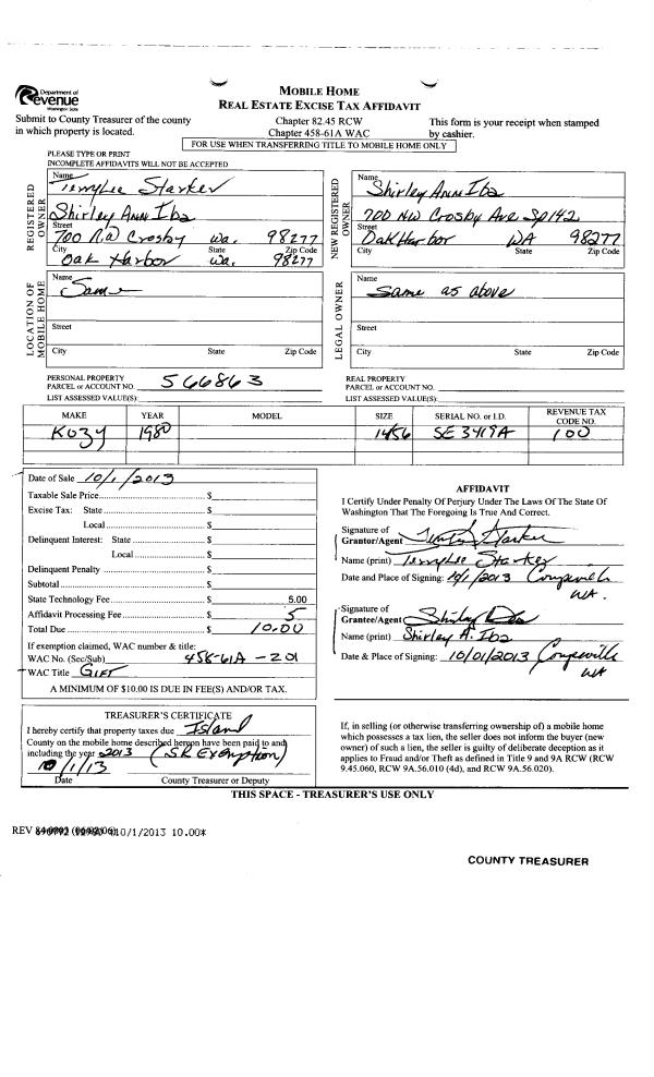 | Mailing Address: | 700 NW CROSBY AVE TRLR 142 OAK HARBOR, WA 98277 | % Ownership: | 100.0000000000% |