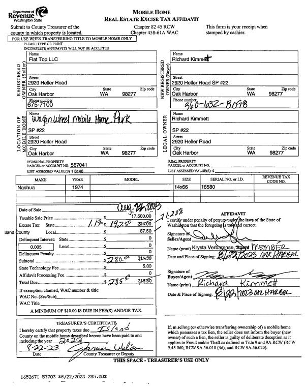 | 1 | 08/22/2023 | MANHOME | Manufactured Home | FLAT TOP, LLC | KIMMET, RICHARD | | | $17,500.00 | 57703 | |