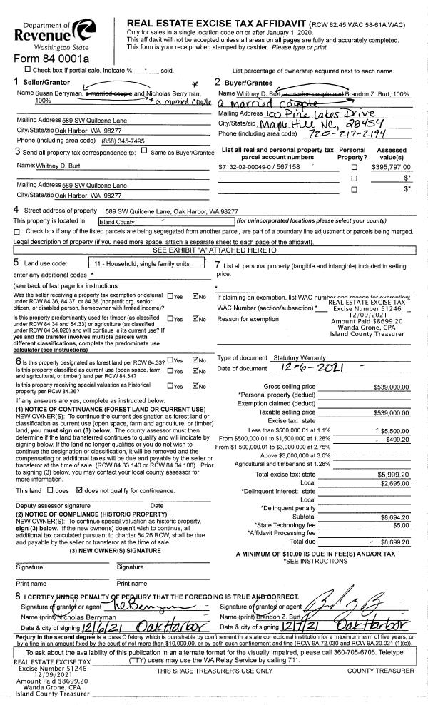 | Mailing Address: | TAYLOR ANITA PITTARD 589 SW QUILCENE LN OAK HARBOR, WA 98277 | % Ownership: | 100.0000000000% |