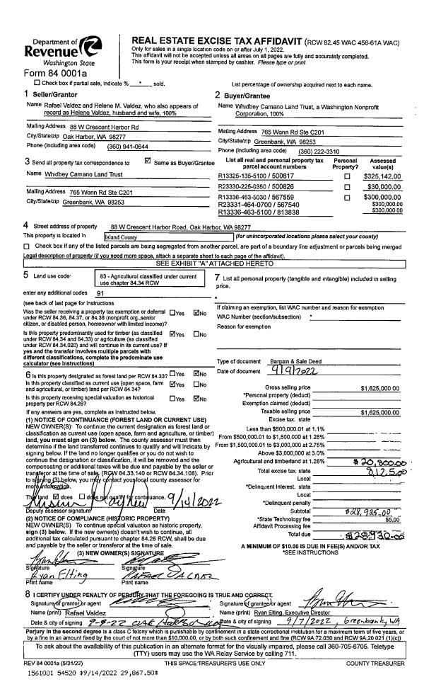 | 3 | 09/09/2022 | BARGSLD | Bargain And Sale Deed | VALDEZ, RAFAEL | WHIDBEY CAMANO LAND TRUST | | | $1,625,000.00 | 54520 | 4551160 |