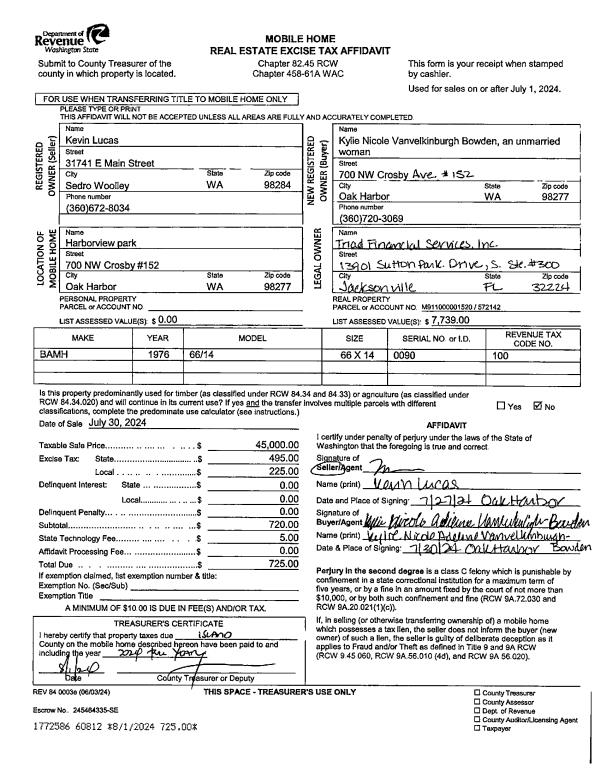 | 1 | 07/30/2024 | MANHOME | Manufactured Home | LUCAS, KEVIN | VANVELKINBURGH BOWDEN, KYLIE NICOLE | | | $45,000.00 | 60812 | |