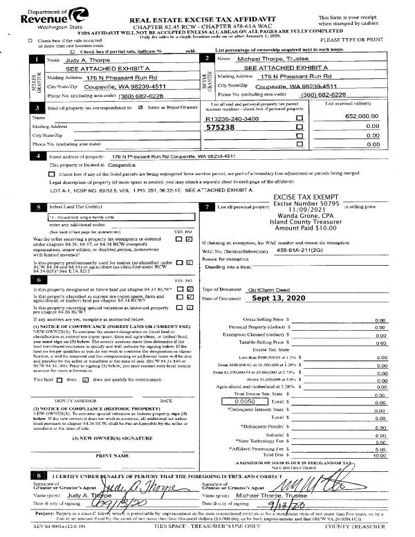 | 4 | 09/13/2020 | QCD | Quit Claim Deed | THORPE, MICHAEL | THORPE TTEE, MICHAEL | | | $0.00 | 50795 | 4534232 |