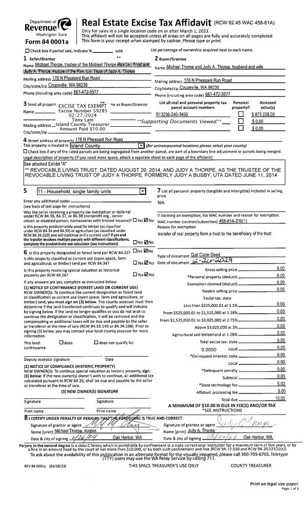 | 3 | 02/26/2024 | QCD | Quit Claim Deed | THORPE TTEE, MICHAEL | THORPE, MICHAEL | | | $0.00 | 59285 | 4569764 |