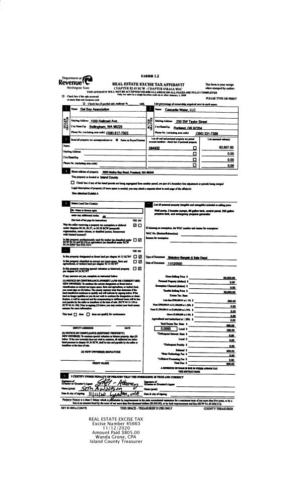 | 1 | 11/09/2020 | BARGSLD | Bargain And Sale Deed | DEL BAY ASSOCIATION | CASCADIA WATER, LLC | | | $50,000.00 | 45663 | 4502137 |