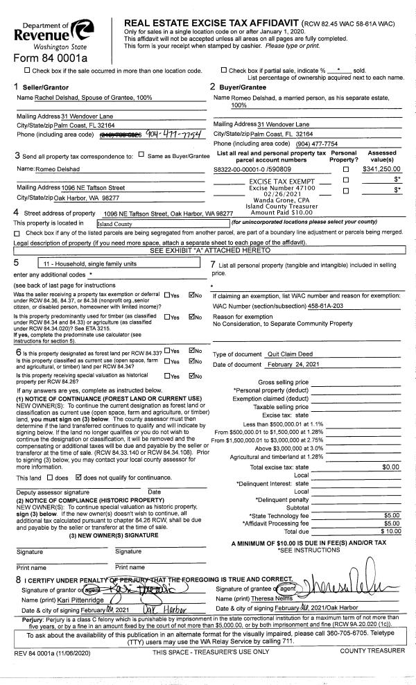 | 1 | 02/24/2021 | QCD | Quit Claim Deed | DLESHAD, RACHEL | DELSHAD, ROMEO | | | $0.00 | 47100 | 4512076 |