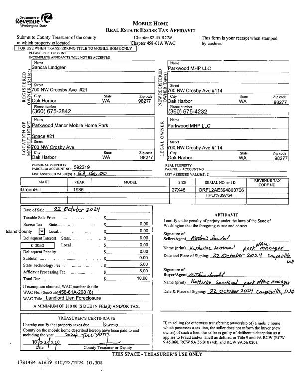 | 2 | 10/22/2024 | MANHOME | Manufactured Home | LINDGREN, SANDRA | PARKWOOD MHP LLC | | | $0.00 | 61639 | |