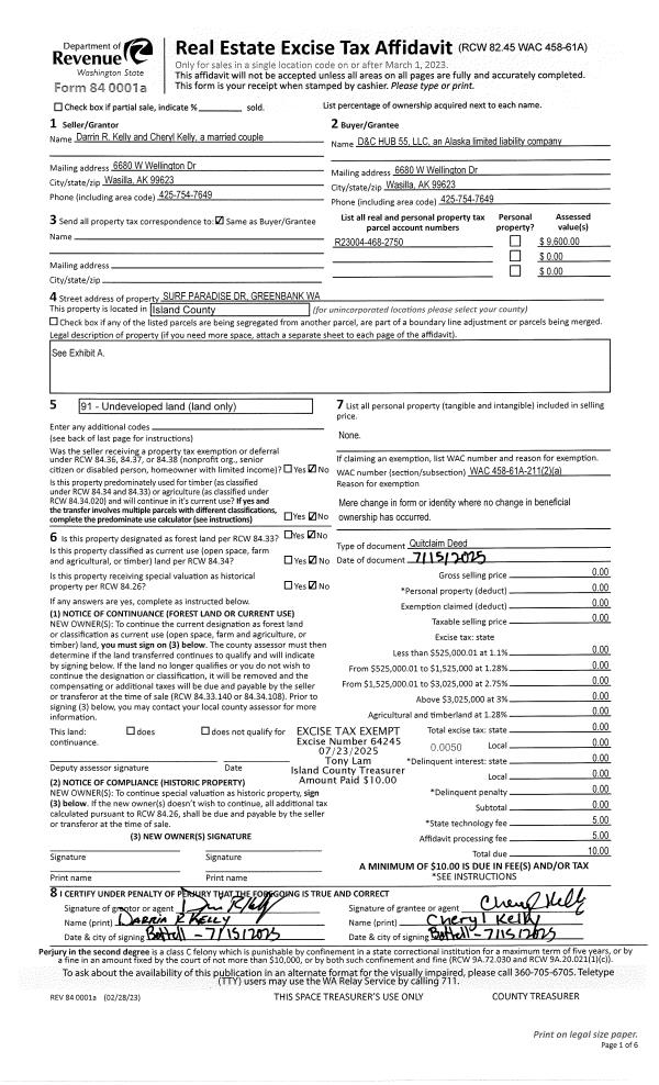 | 1 | 07/15/2025 | QCD | Quit Claim Deed | KELLY, DARRIN R | D&C HUB 55, LLC | | | $0.00 | 64245 | 4588675 |