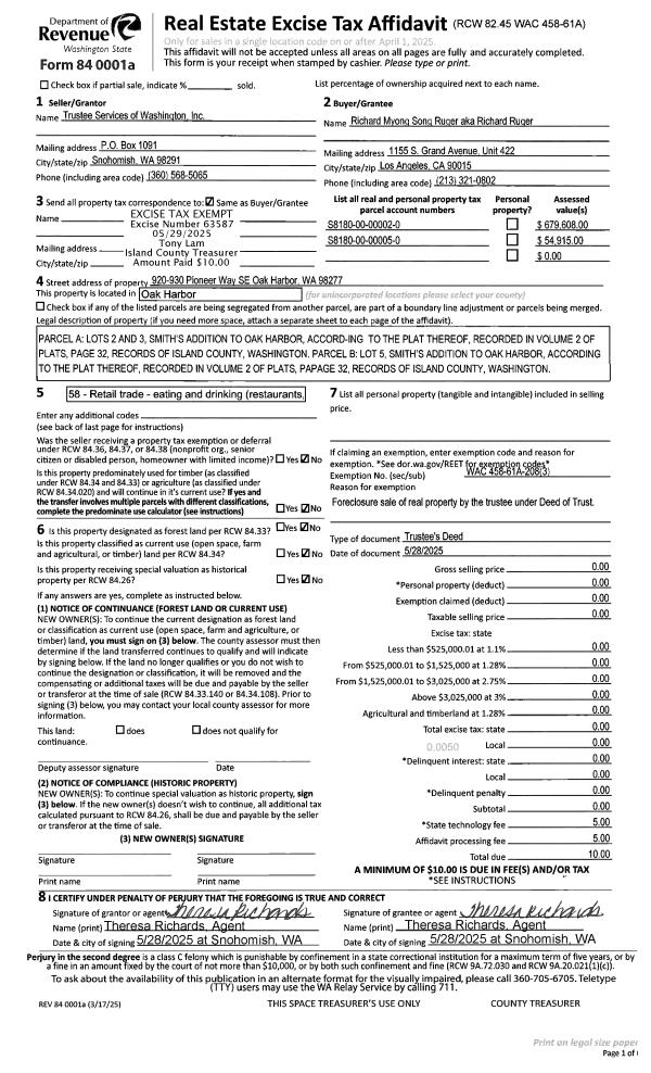 | 1 | 05/28/2025 | TRUSTEED | Trustee's Deed | TRUSTEE SERVICES OF WASHINGTON, INC | RUGER, RICHARD MYONG SONG | | | $0.00 | 63587 | 4586315 |