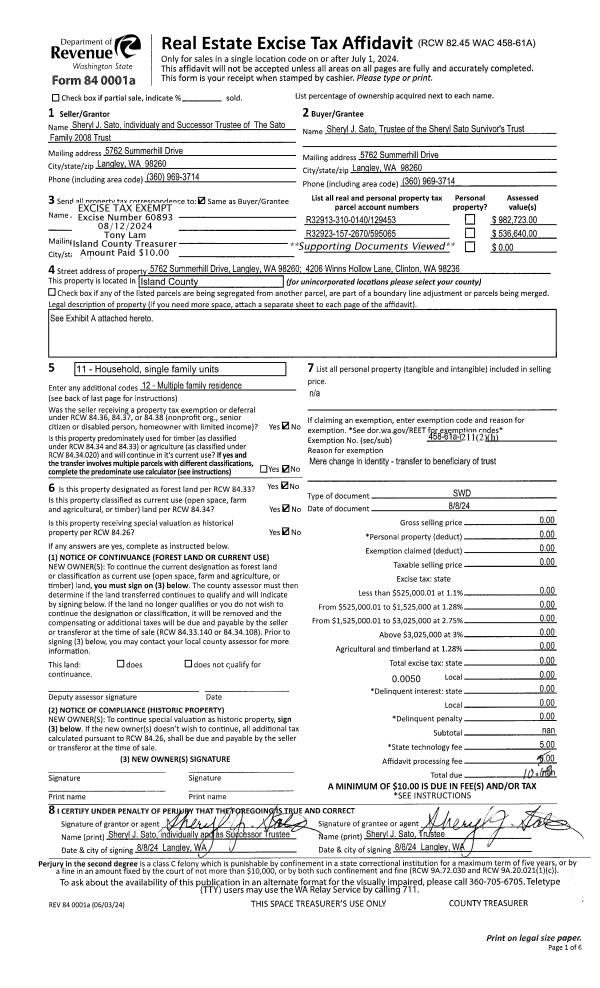 | 1 | 08/08/2024 | WD | Warranty Deed | SATO TRUSTEE, DONALD A | SATO TTEE, SHERYL J | | | $0.00 | 60893 | 4575661 |