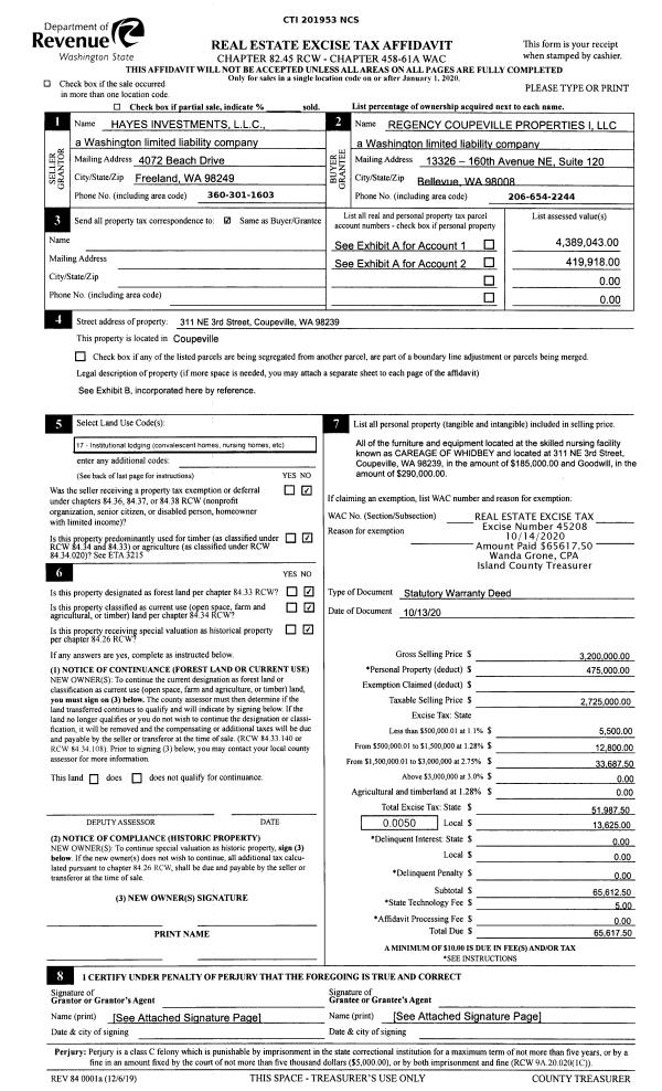 | 1 | 10/13/2020 | WD | Warranty Deed | REGENCY COUPEVILLE PROPERTIES I, LLC | WHIDBEY ISLAND PUBLIC HOSPITAL DISTRICT | | | $725,000.00 | 45209 | 4499260 |