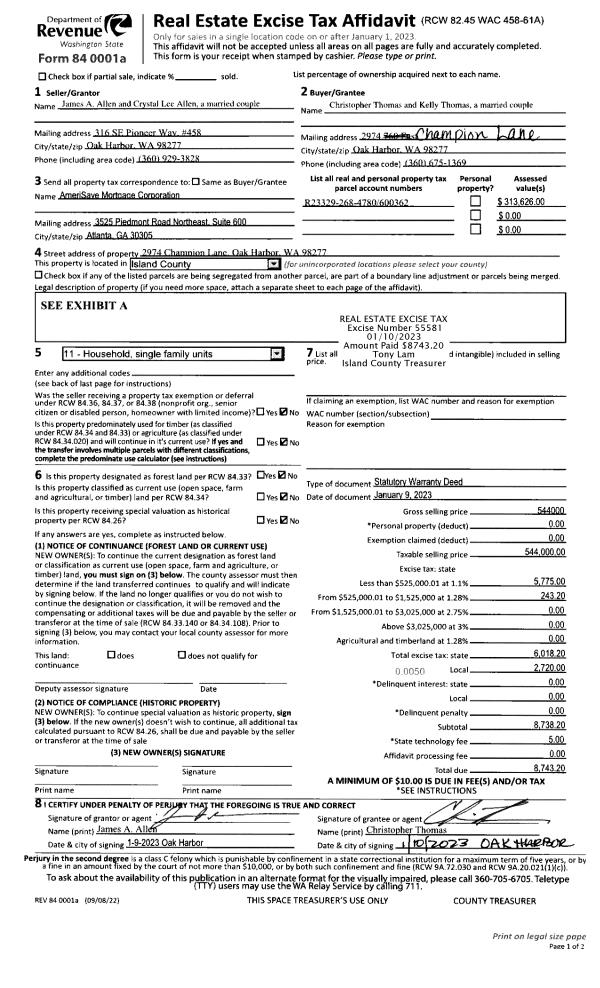 | 1 | 01/09/2023 | WD | Warranty Deed | ALLEN, JAMES A | THOMAS, CHRISTOPHER | | | $544,000.00 | 55581 | 4555562 |