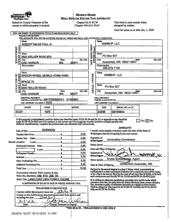 | 1 | 03/08/2022 | MANHOME | Manufactured Home | PAUL III, ROBERT MILES | WWMHP, LLC | | | $0.00 | 52237 | |