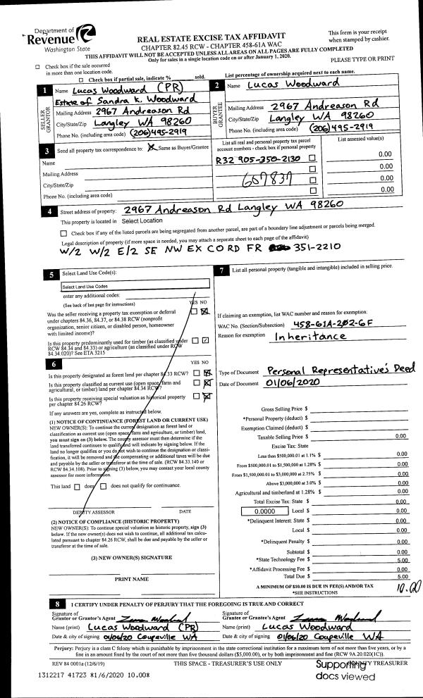 | 1 | 01/06/2020 | PRD | Personal Representatives Deed | WOODWARD, SANDRA K | WOODWARD, LUCAS | | | $0.00 | 41723 | 4478781 |