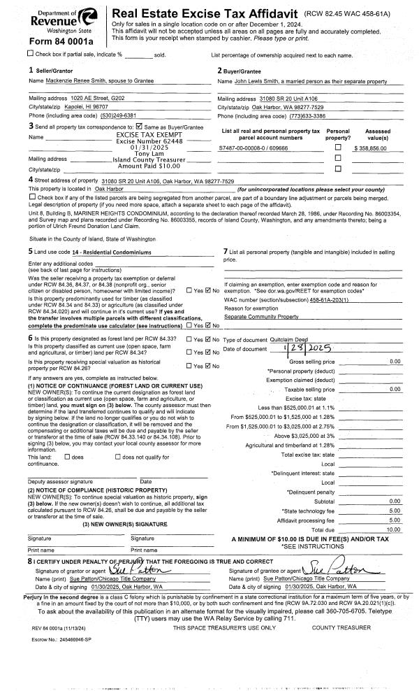 | 1 | 01/28/2025 | QCD | Quit Claim Deed | SMITH, MACKENZIE RENEE | SMITH, JOHN LEWIS | | | $0.00 | 62448 | 4581789 |