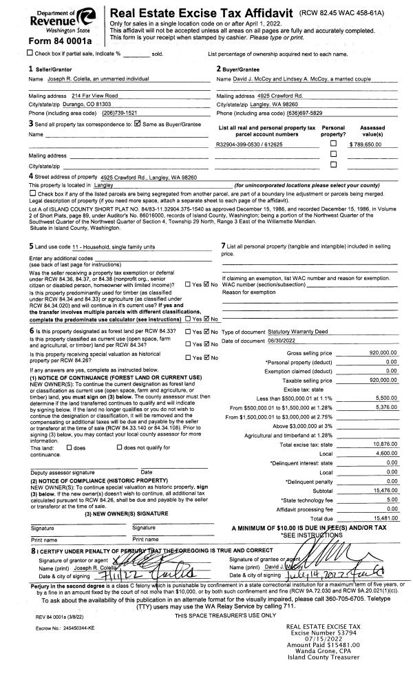 | Mailing Address: | LINDSEY A MCCOY 4925 CRAWFORD RD LANGLEY, WA 98260 | % Ownership: | 100.0000000000% |